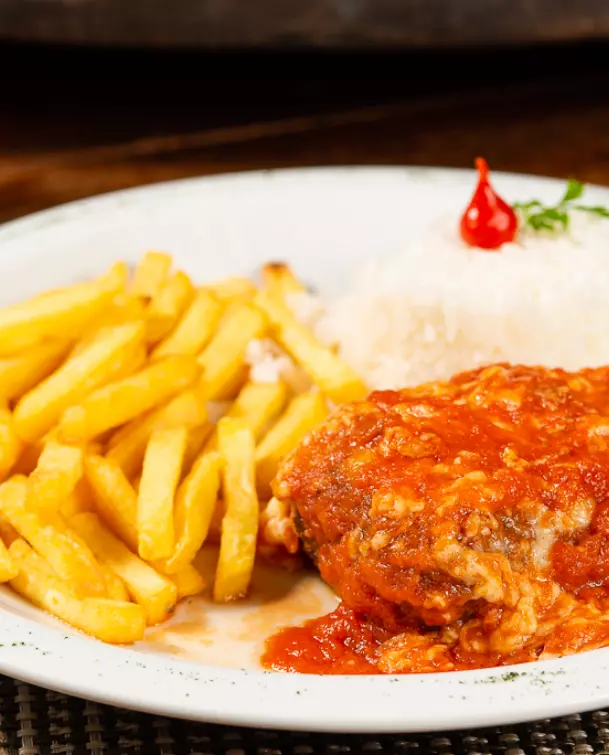 Filé à milanesa, molho de tomate, recheado com queijo muçarela e presunto, guarnecido de arroz branco e batata frita.